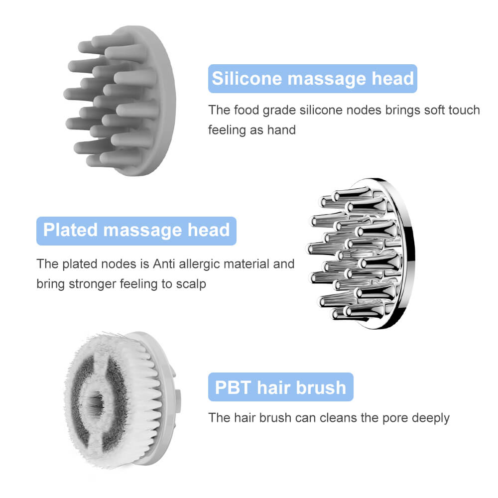 Coarse scalp massage head for stimulating circulation, soft scalp massage head for gentle relaxation, and a soft fiber cleansing brush head for deep facial cleansing.