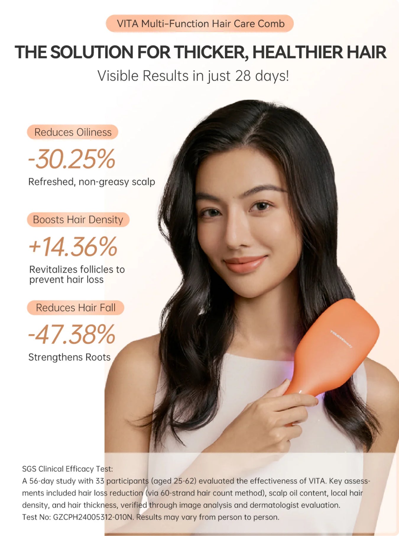 After consistent use over 4 weeks, the VITA comb effectively addresses dandruff issues. You'll experience a dramatic reduction in flakes, promoting a clearer, more comfortable scalp that enhance hair quality.