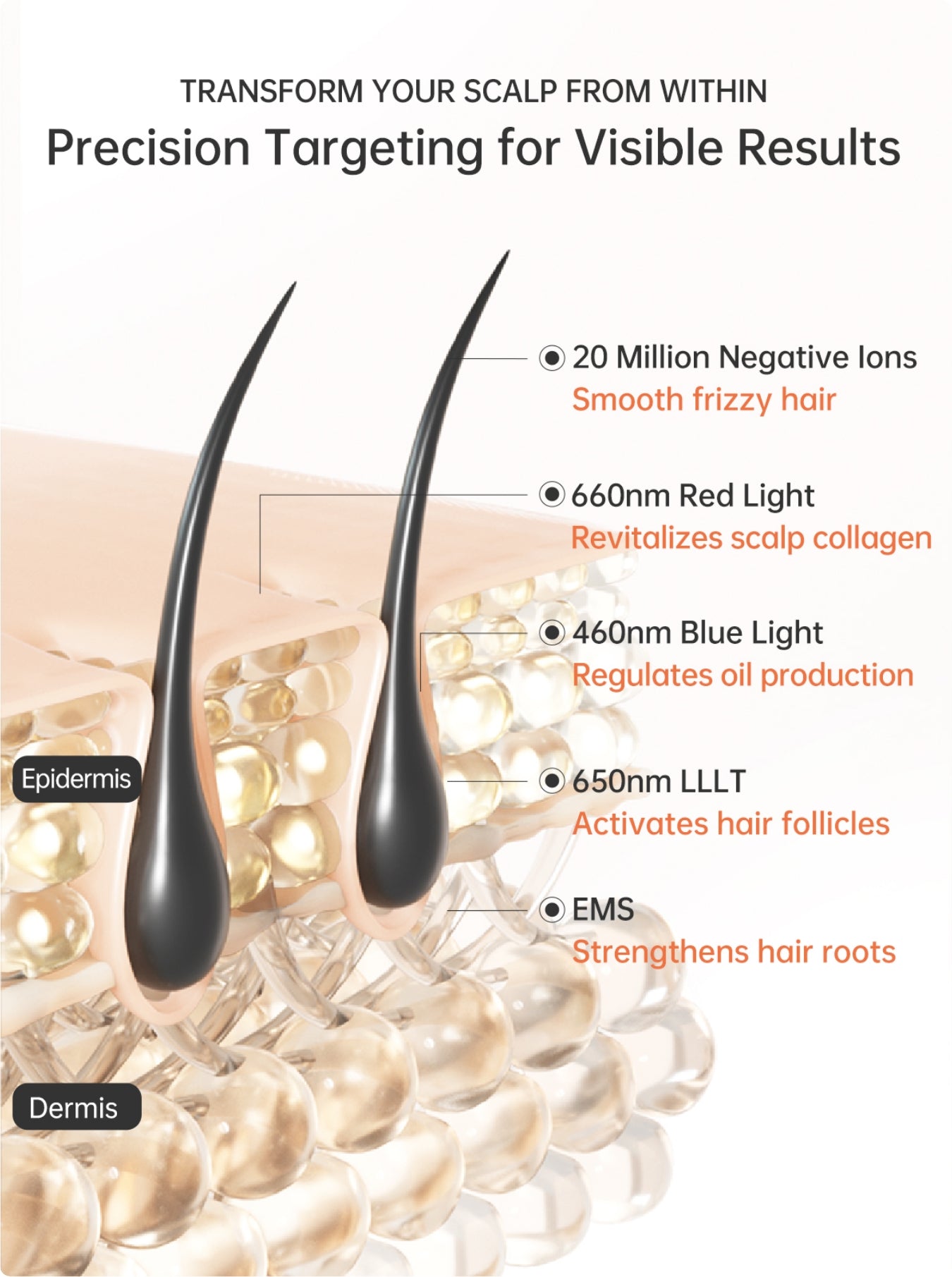 Delivers microcurrents across the scalp to stimulate tissue activity,strengthen roots,and reduce hair loss or breakage.