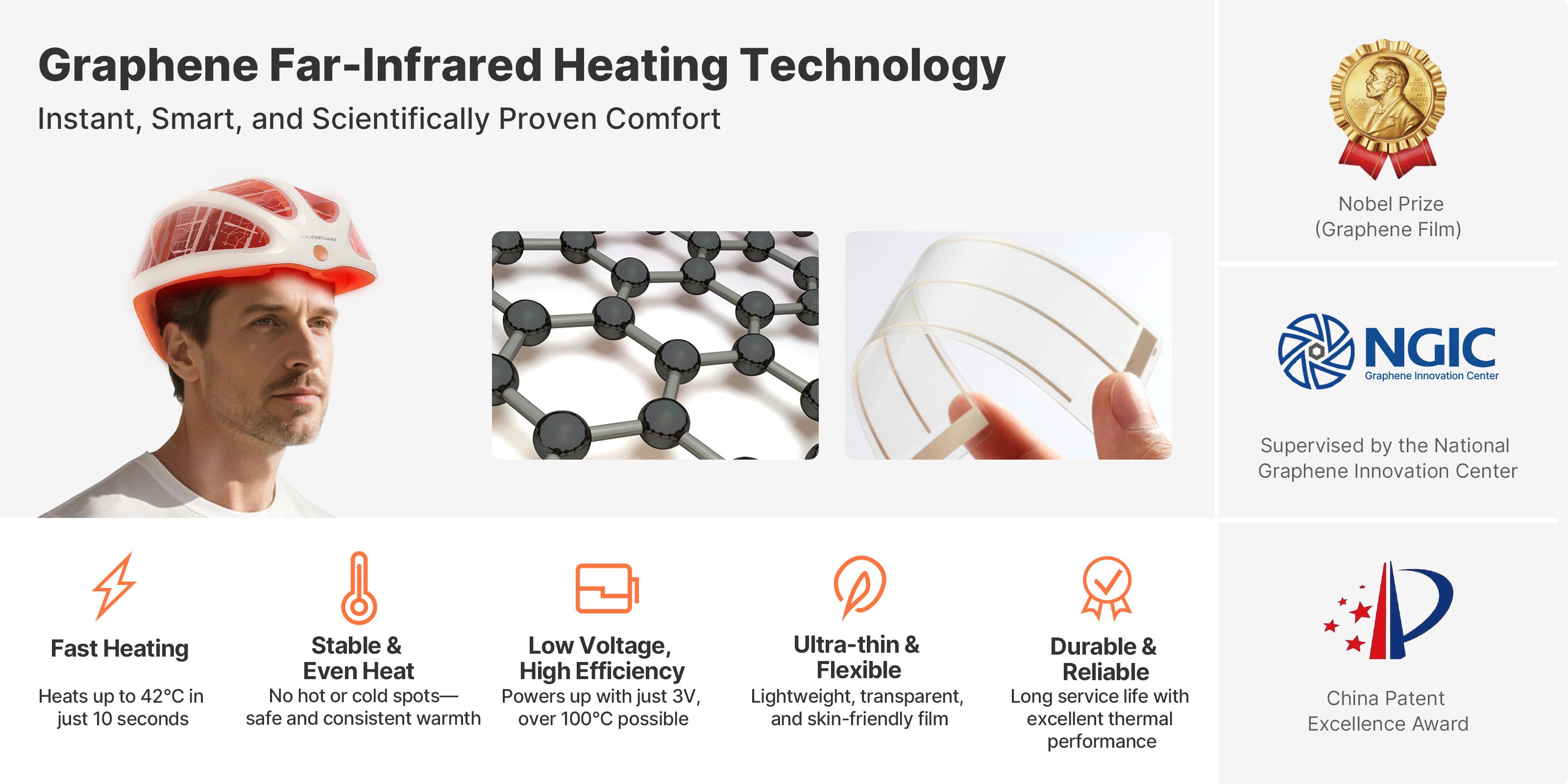 Honeycomb graphene film heats in 3s, reaches 42°C in 10s, and delivers steady, uniform warmth.
